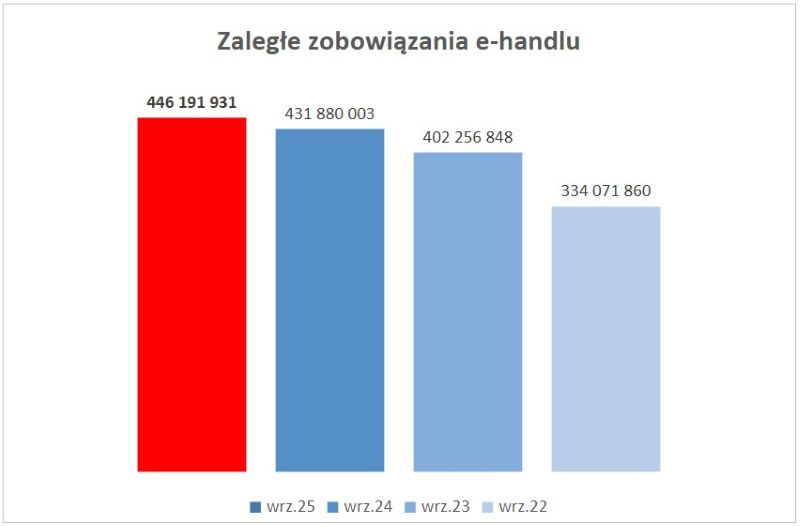 • W tym samym czasie przeterminowane zadłużenie e-commerce (PKD 4791Z) wzrosło  o ponad 14 mln zł do 446,2 mln zł i aż o 112 mln zł od września 2022 roku.