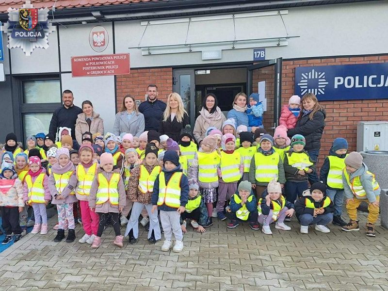 Dzieci z Przedszkola Publicznego im. Jana Brzechwy w Grębocicach odwiedziły posterunek policji, poznały sprzęt i zasady bezpieczeństwa, zobaczyły radiowóz i otrzymały odblaski oraz upominki.